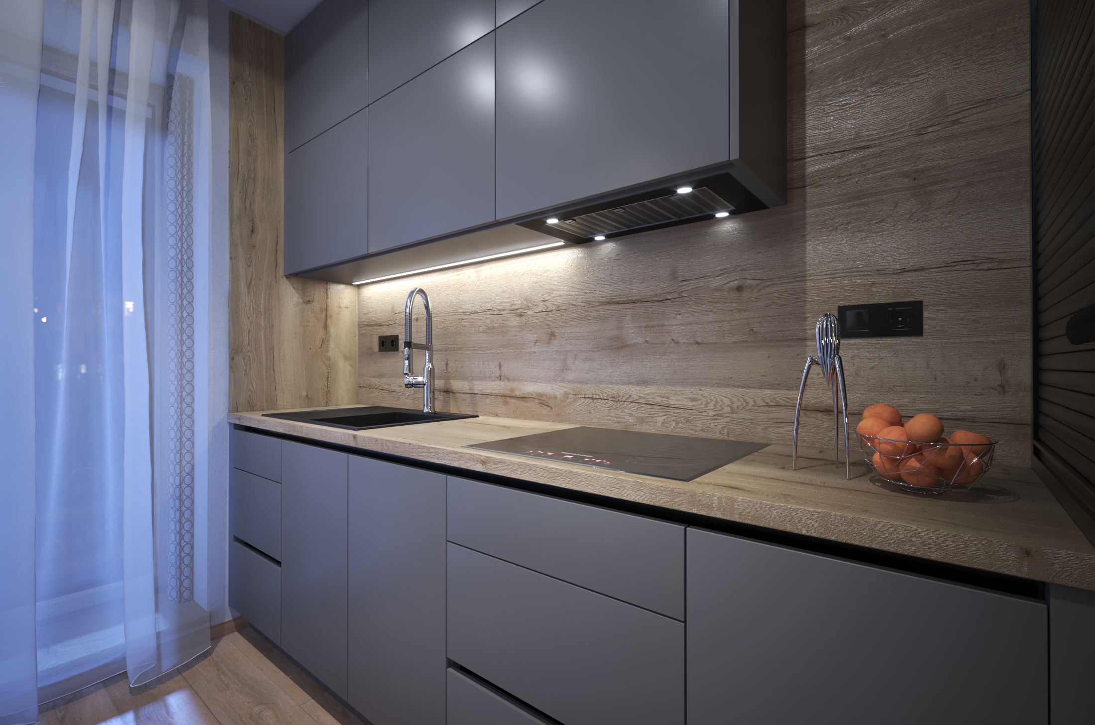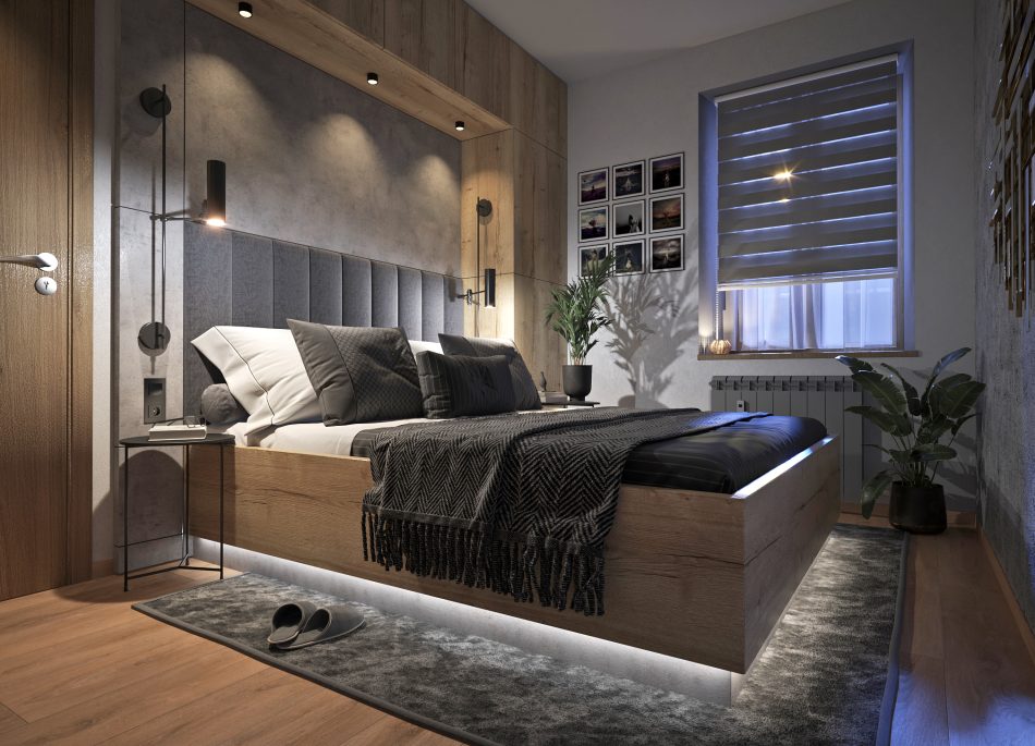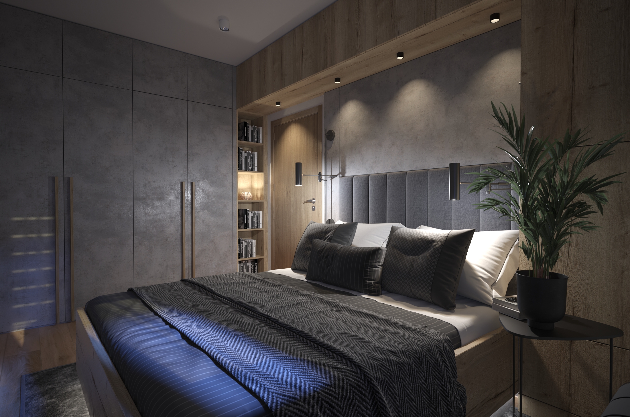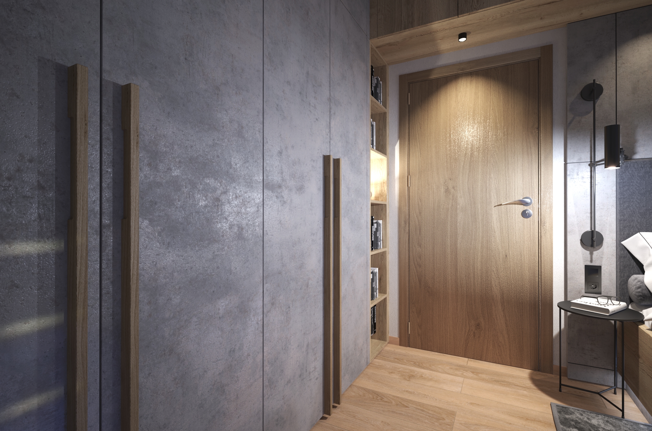 Projekt penzionu Chrastava je navržen se zaměřením na detail a moderní design. Šedé tóny se snoubí s dubovým dřevěným dekorem a imitací betonu, což vytváří skvělý kontrast s černými prvky v interiéru. V kuchyni to jsou spotřebiče, černá roletka a zafrézované úchytky, v ložnici pak černá svítidla a stolky. A abychom dodali interiéru ještě víc na atmosféře, využili jsme betonovou stěrku na stěnách.