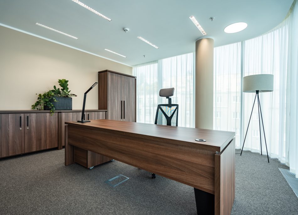 Manažerské a ředitelské kanceláře jsou vybaveny nábytkem Office Pro v provedení ořechového dřeva, doplněného o černé úchytky, které přidávají na luxusu a sofistikovanosti. Zasedací místnosti dominují stoly s podnoží Trig od Alupress design, což vytváří dokonalé místo pro tvůrčí práci a strategické plánování. Tyto místnosti jsou také doplněny o obklady stěn v kombinaci lamino desek a skla.
