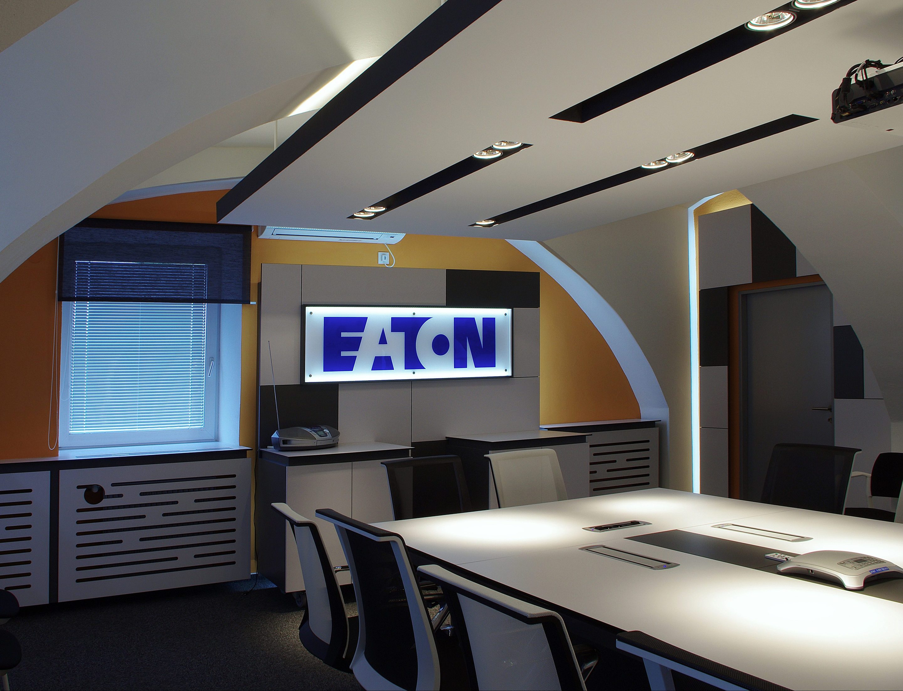 Oživte svou zasedací místnost s novým nádechem modernosti. Naše řešení pro Eaton se rozprostírá na úctyhodné ploše 130m2 a vyniká kombinací bílé, antracitové a oranžové barvy. Prostor je doplněn podsvětleným logem Eaton, které dodává místnosti jedinečný charakter. A to není vše, magický efekt vytváří i LED podsvětlení za LTD obklady a v podhledu.