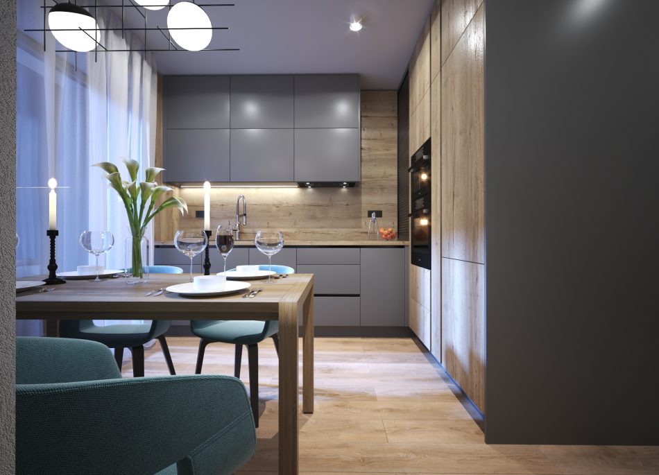 Projekt penzionu Chrastava je navržen se zaměřením na detail a moderní design. Šedé tóny se snoubí s dubovým dřevěným dekorem a imitací betonu, což vytváří skvělý kontrast s černými prvky v interiéru. V kuchyni to jsou spotřebiče, černá roletka a zafrézované úchytky, v ložnici pak černá svítidla a stolky. A abychom dodali interiéru ještě víc na atmosféře, využili jsme betonovou stěrku na stěnách.