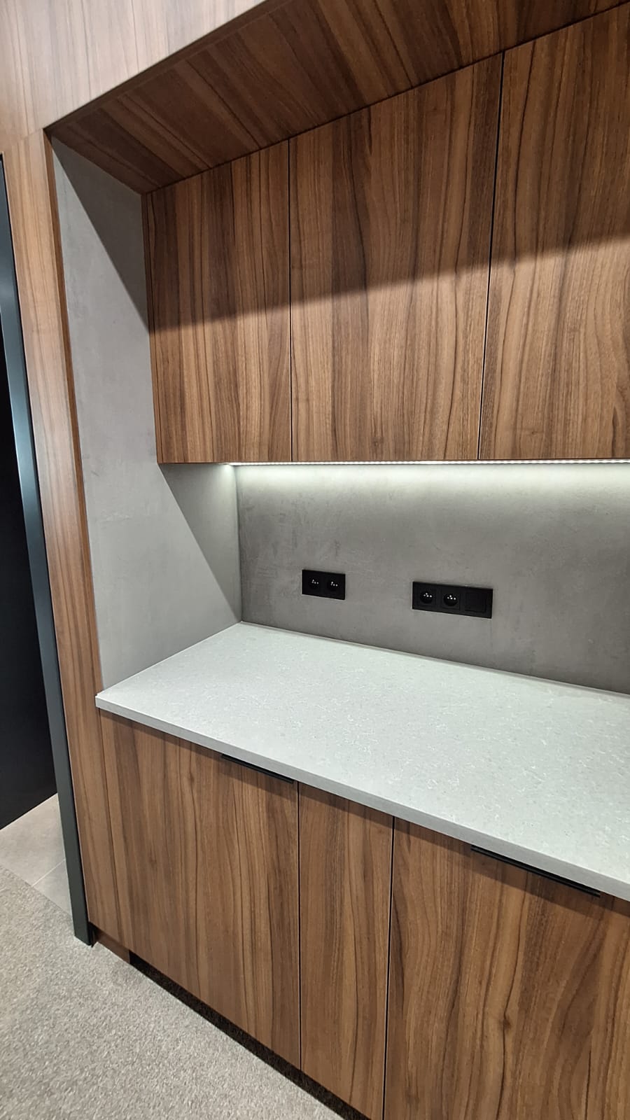 Kuchyňky jsou vyrobené s ohledem na nejnovější trendy v interiérovém designu a jsou dokonalou kombinací ořechového dřevo dekoru a betonové stěrky, doplněné o černé prvky a pracovní desky z umělého kamene. Každý detail je pečlivě promyšlen a slouží k vytvoření harmonického a uceleného celku.
