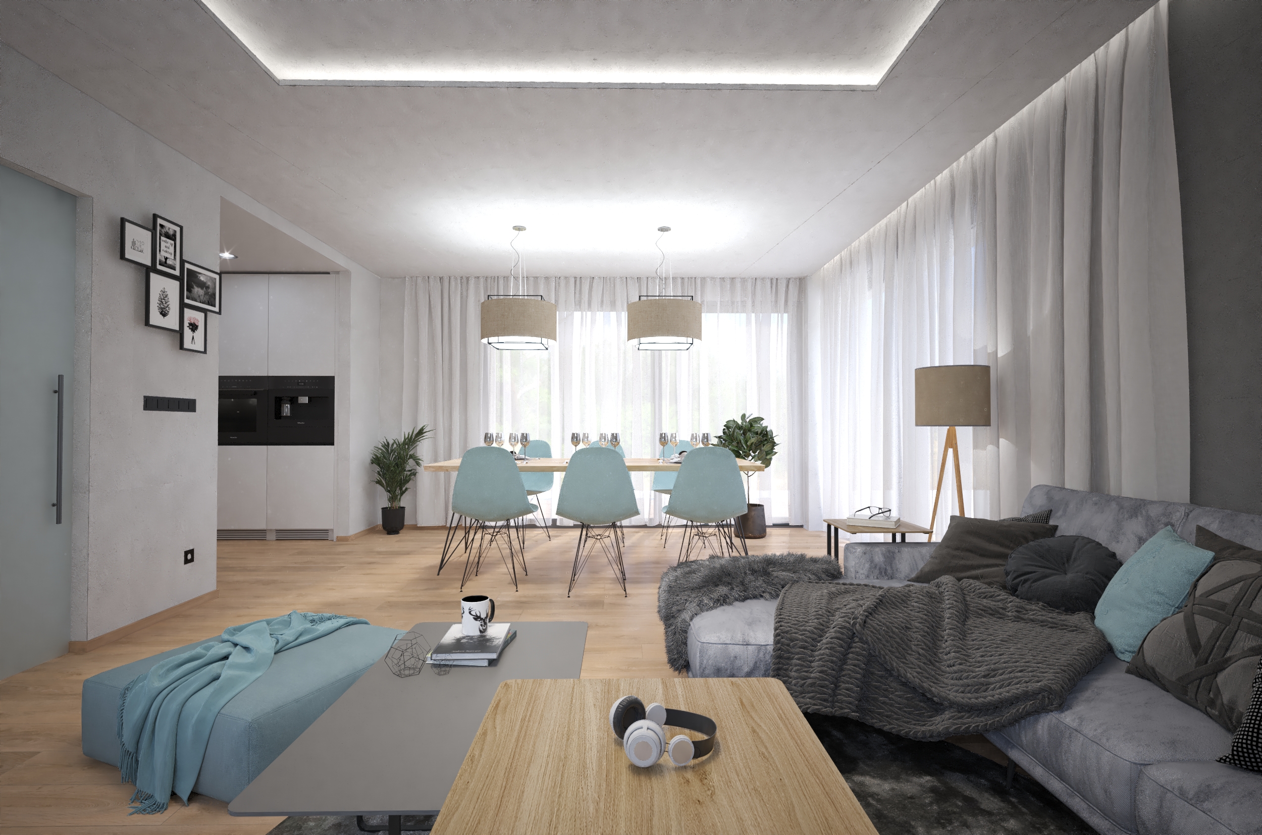 Tento rodinný dům byl dokončen v roce 2022 s úmyslem vytvořit prostorný, moderní a minimalistický prostor pro celou rodinu. Dům je vybaven, námi navrženým a dodaným, nábytkem ve všech místnostech, od obývacího pokoje spojeného s kuchyní a jídelnou, přes dva dětské pokoje, ložnici, dvě pracovny až po předsíň. Styl kombinuje dřevo s chladnou šedou a čistou bílou, který je doplněný o prvky s imitací betonu v jedné z pracoven. A to není vše!
